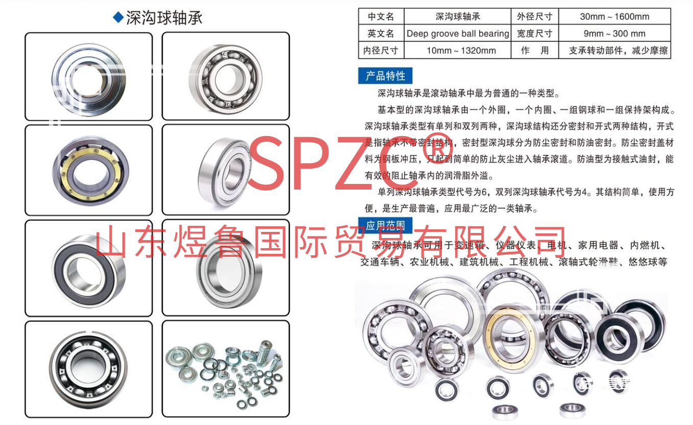 深沟球轴承主要用于承受纯径向载荷,也可同时承受径向载荷和轴向载荷。当其仅承受纯径向载荷时,接触角为零。当深沟球轴承具有较大的径向游隙时,具有角接触轴承的性能,可承受较大的轴向载荷 。深沟球轴承的摩擦系数很小,极限转速也很高, 特别是在轴向载荷很大的高速运转工况下,深沟球轴承比推力球轴承更有优越性。